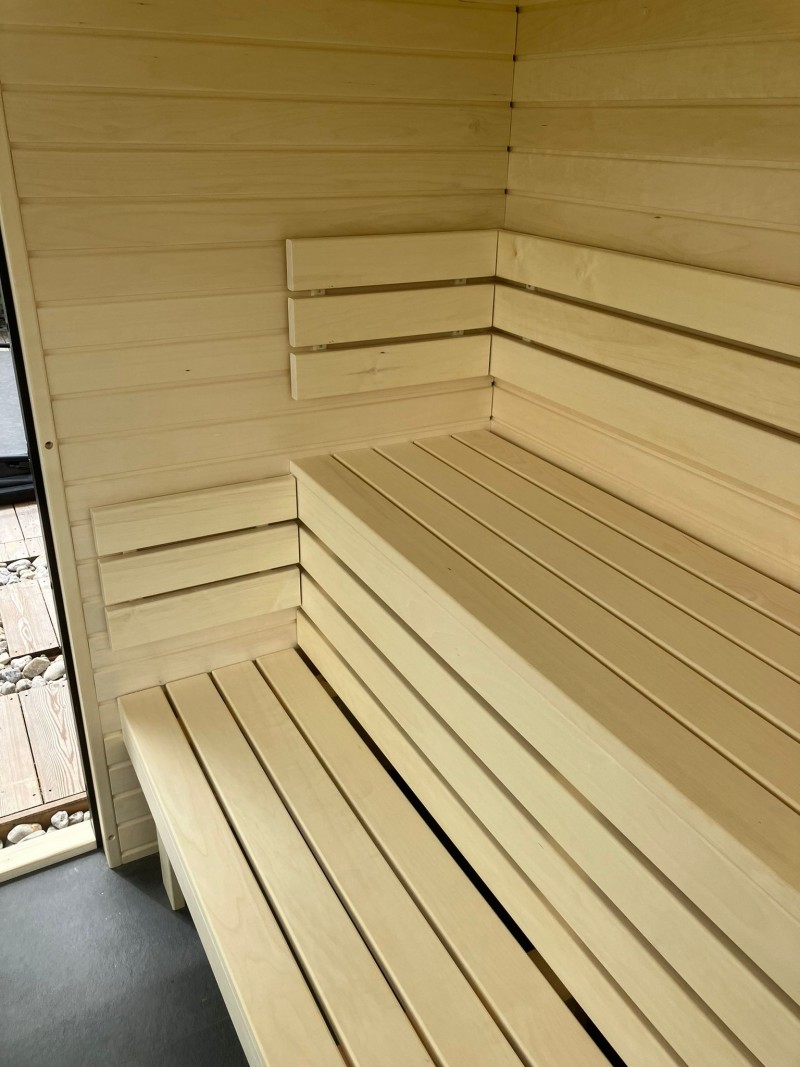 Na stěny a strop byl použit materiál thermo osika. Na lavičky jsme použili materiál abachi pro své skvělé vlastnosti. Zejména kvůli tomu, že nehrozí žádné popálení. Materiál si drží příjemnou teplotu.
